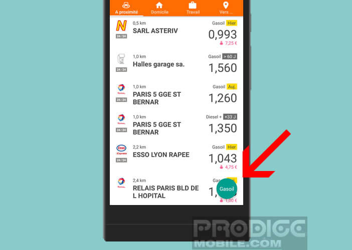 - Cliquez ensuite sur le nom de la station service de votre choix pour faire apparaître sa position sur une carte