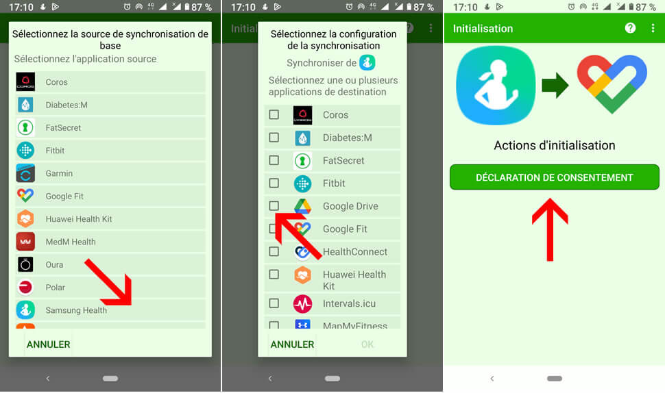 - Définissez Google Fit comme destination des données et confirmez votre sélection en appuyant sur le bouton Déclaration de consentement